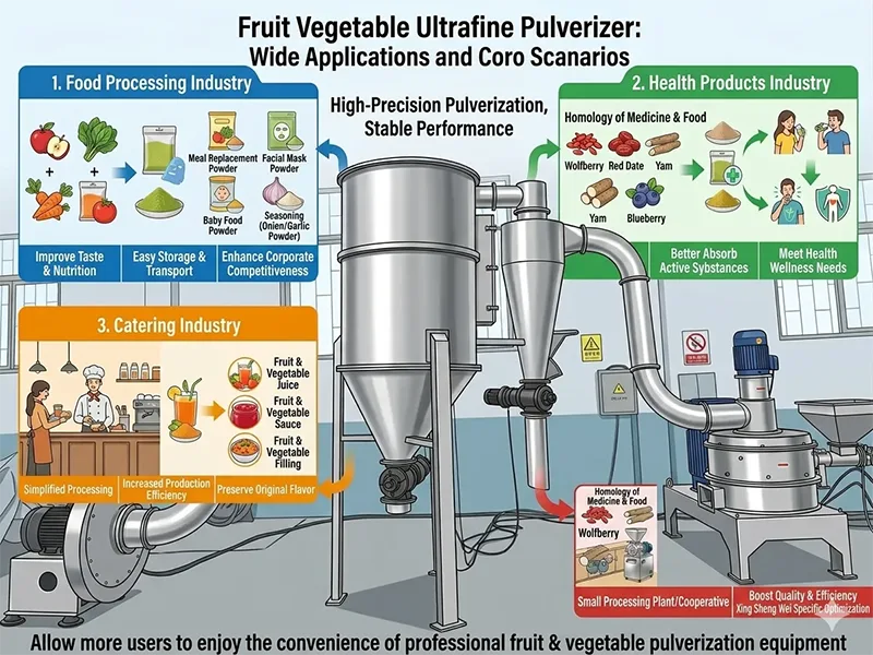 ফ্রুট ভেজিটেবল আল্ট্রাফাইন পাল্ভারাইজার, এর উচ্চ-নির্ভুলতা ক্রাশিং সুবিধা এবং স্থিতিশীল কর্মক্ষমতা সহ, একাধিক ক্ষেত্রে ব্যাপকভাবে ব্যবহৃত হয়। মূল অ্যাপ্লিকেশন পরিস্থিতি নিম্নরূপ: